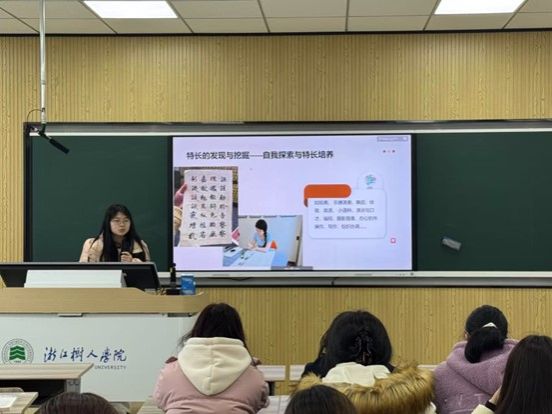 紧接着,同样来自公共事业管理231班的文美以独特的视角分享了她的竞赛故事。作为一名书法特长生,她将自己的兴趣爱好转化为竞赛优势,在省级比赛中获得佳绩。她鼓励同学们:“多了解自己的兴趣与特长,并勇敢尝试将其发展为个人优势,这将成为未来竞赛乃至人生道路上的重要助力。”她的分享激发了同学们对自身潜能的思考,也展现了多元化发展的可能性。